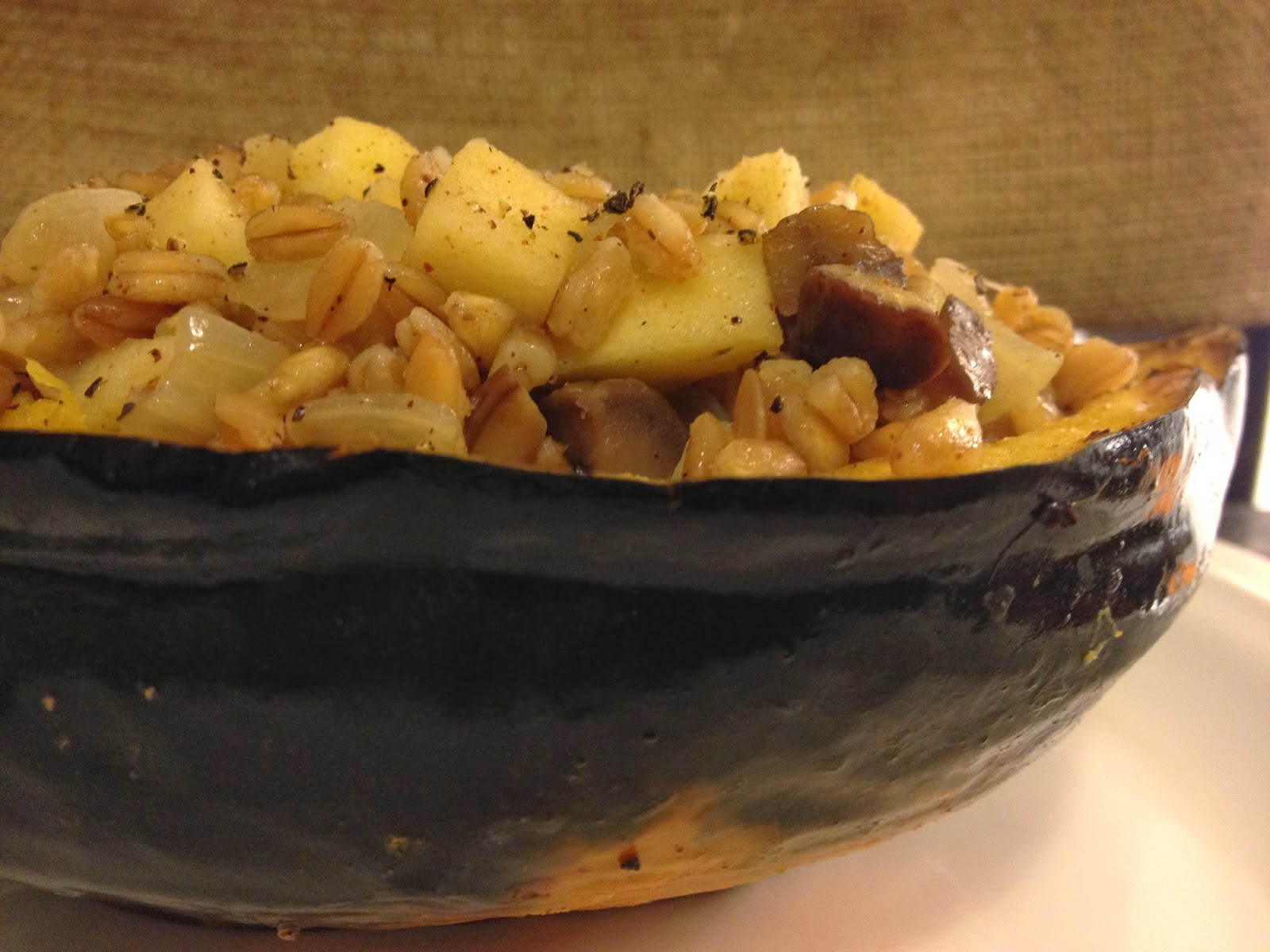Roasted Acorn Squash Stuffed with Farro, Apples, Chestnuts and Nutmeg